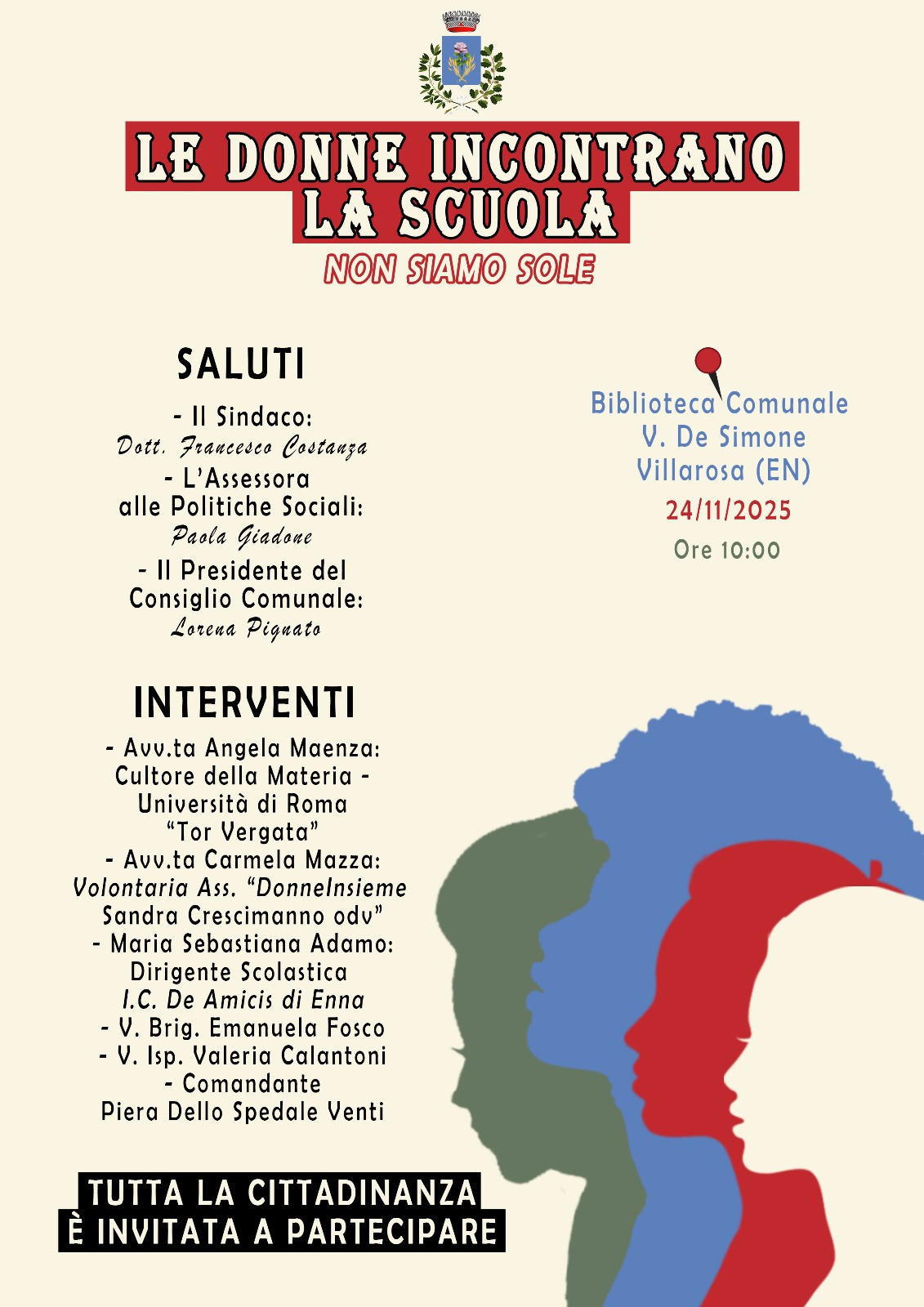 In data 24 novembre, alle ore 10,00, presso la Biblioteca Comunale, si svolgerà l'evento dal titolo "Le donne incontrano la scuola" rivolto agli alunni fequentanti la scuola media e tutta la cittadinanza interessata. (Locandina in allegato)